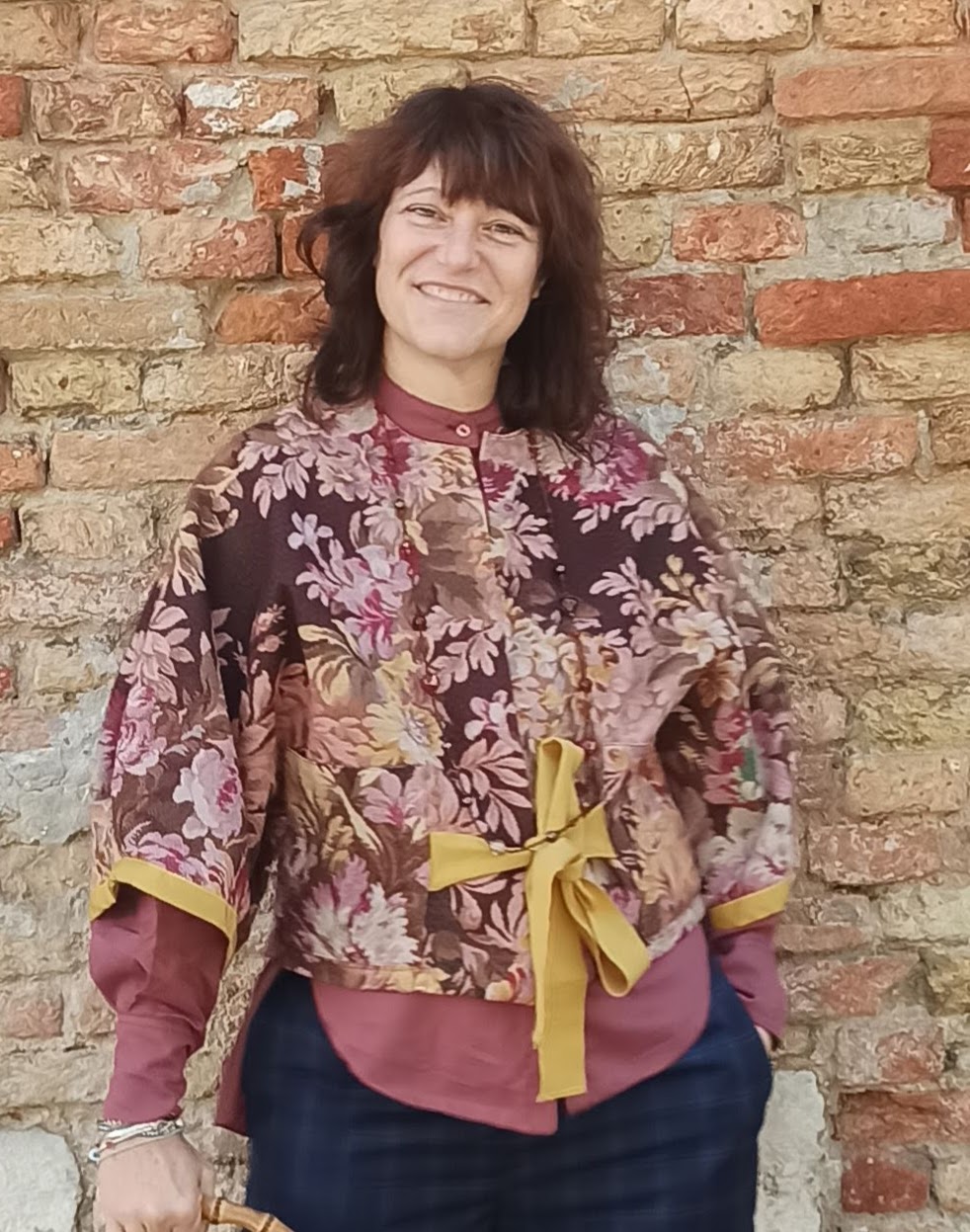 Ciacca in tessutomisto viscosa/cotone dal disegno damascato. Manica vaporosa misura 3/4 con canettè ocra sul fondo