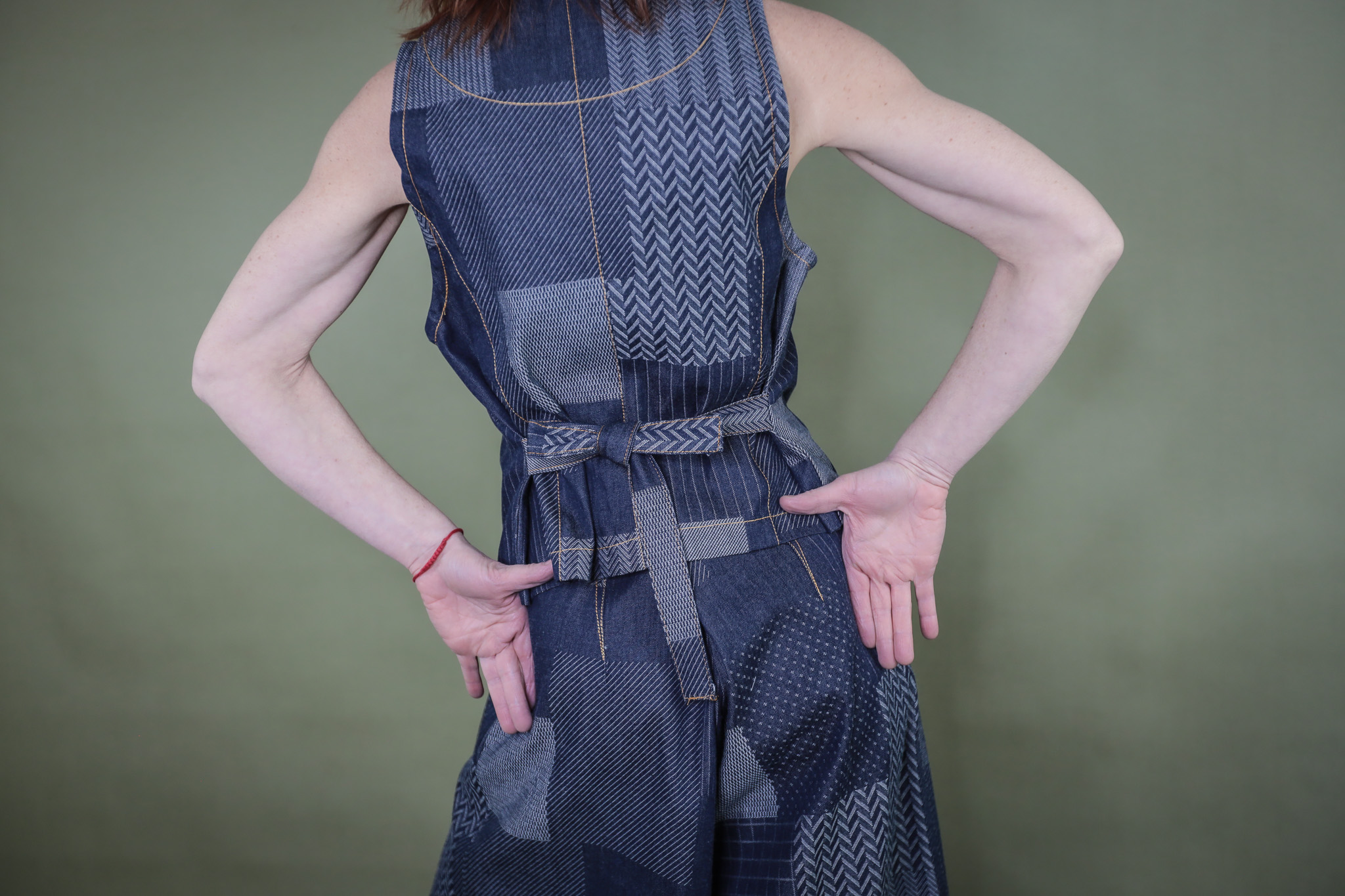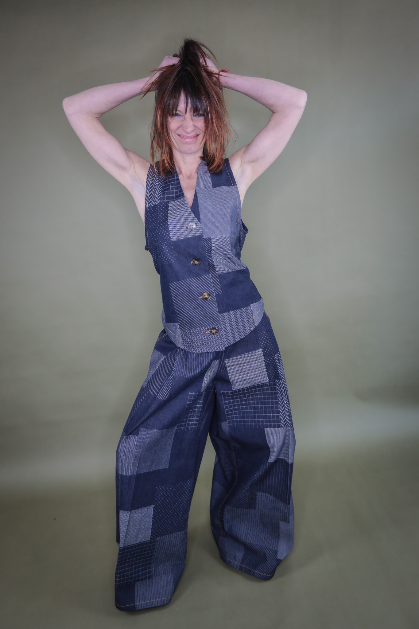 Gilet lungo in tessuto jeans patchwork con ribattiture ocra e bottoni marmorizzati