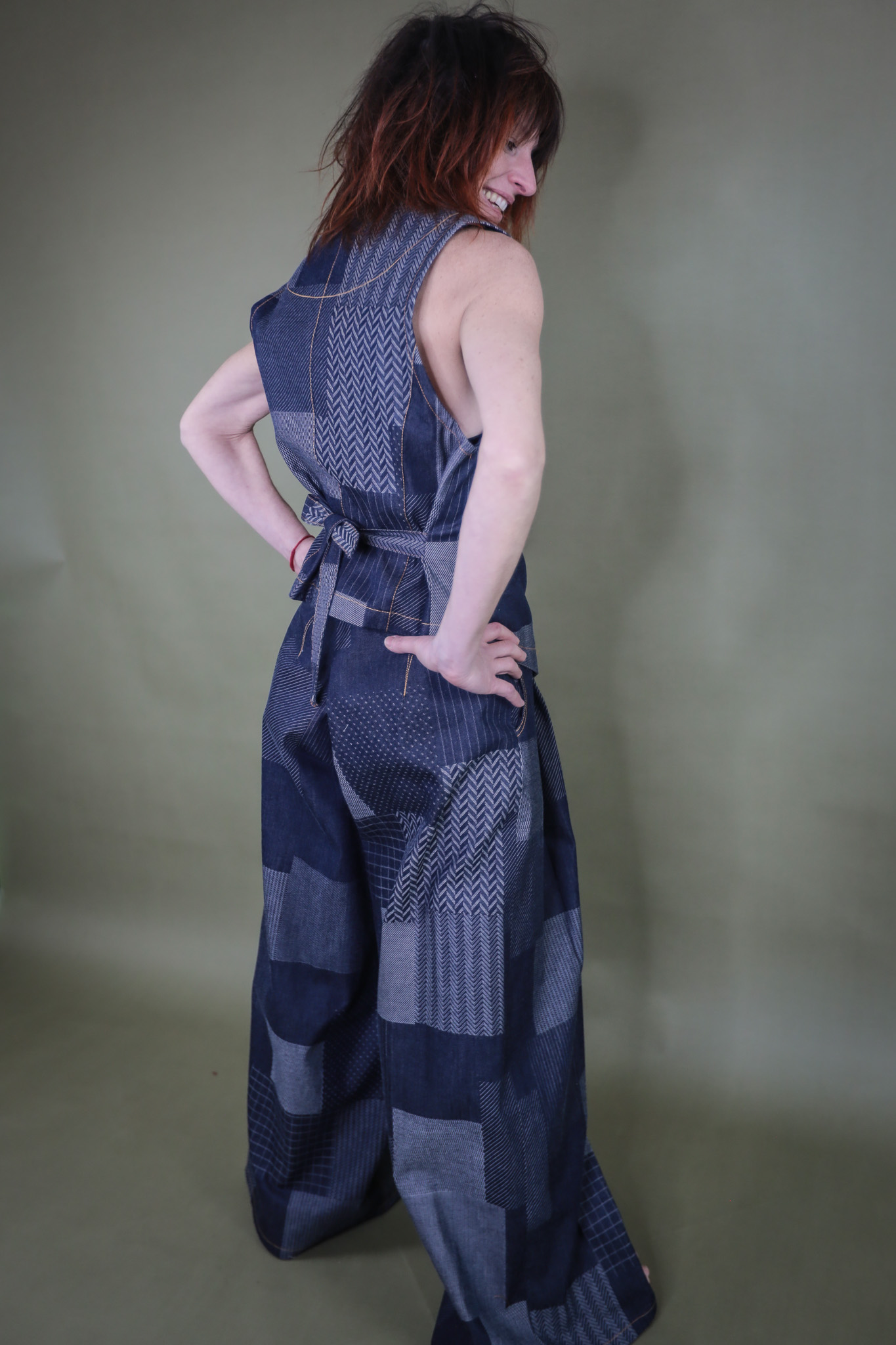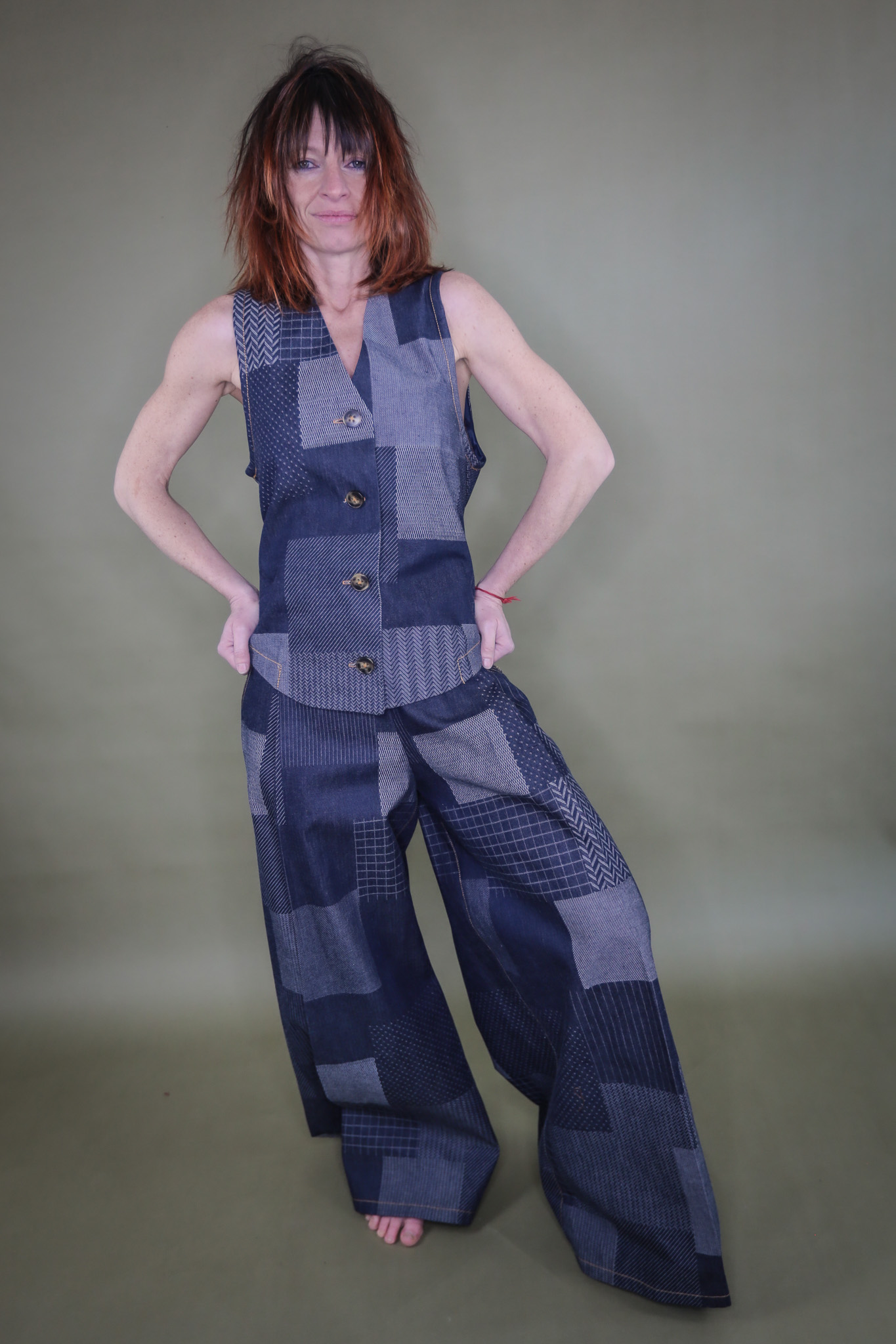 Pantaloni in Jeans patchwork con tasche all’americana e piega sul davanti. tasche a toppa sul dietro, cerniera su fianco invisibile.