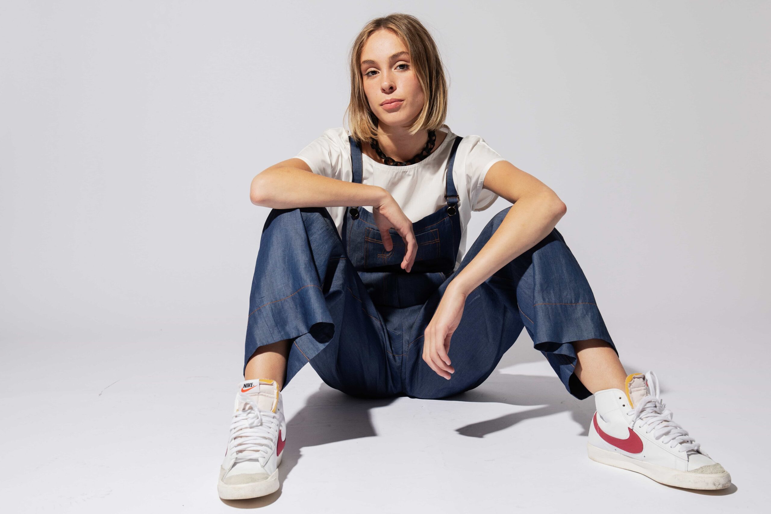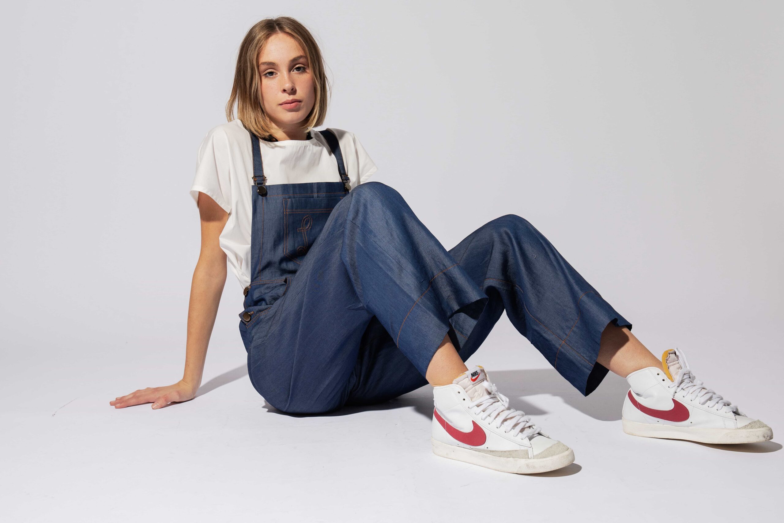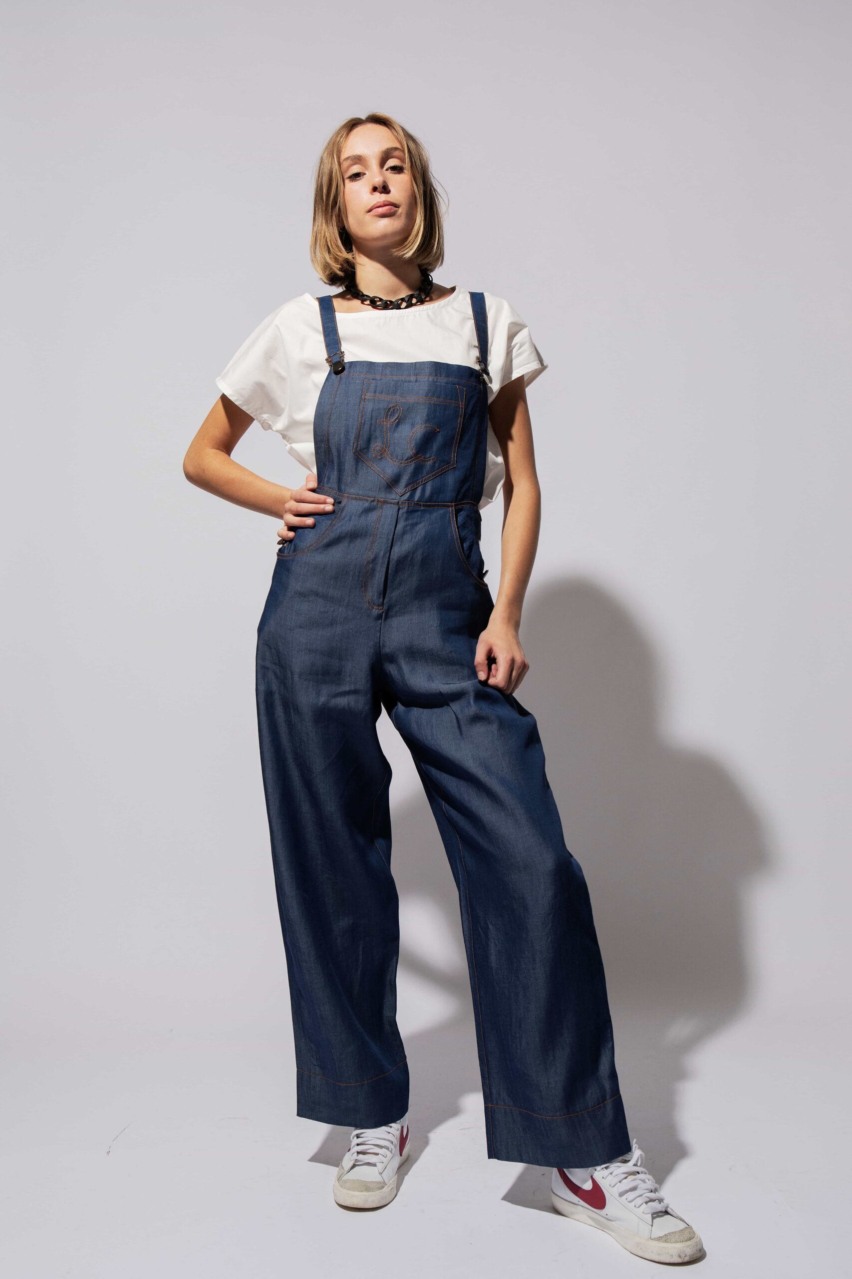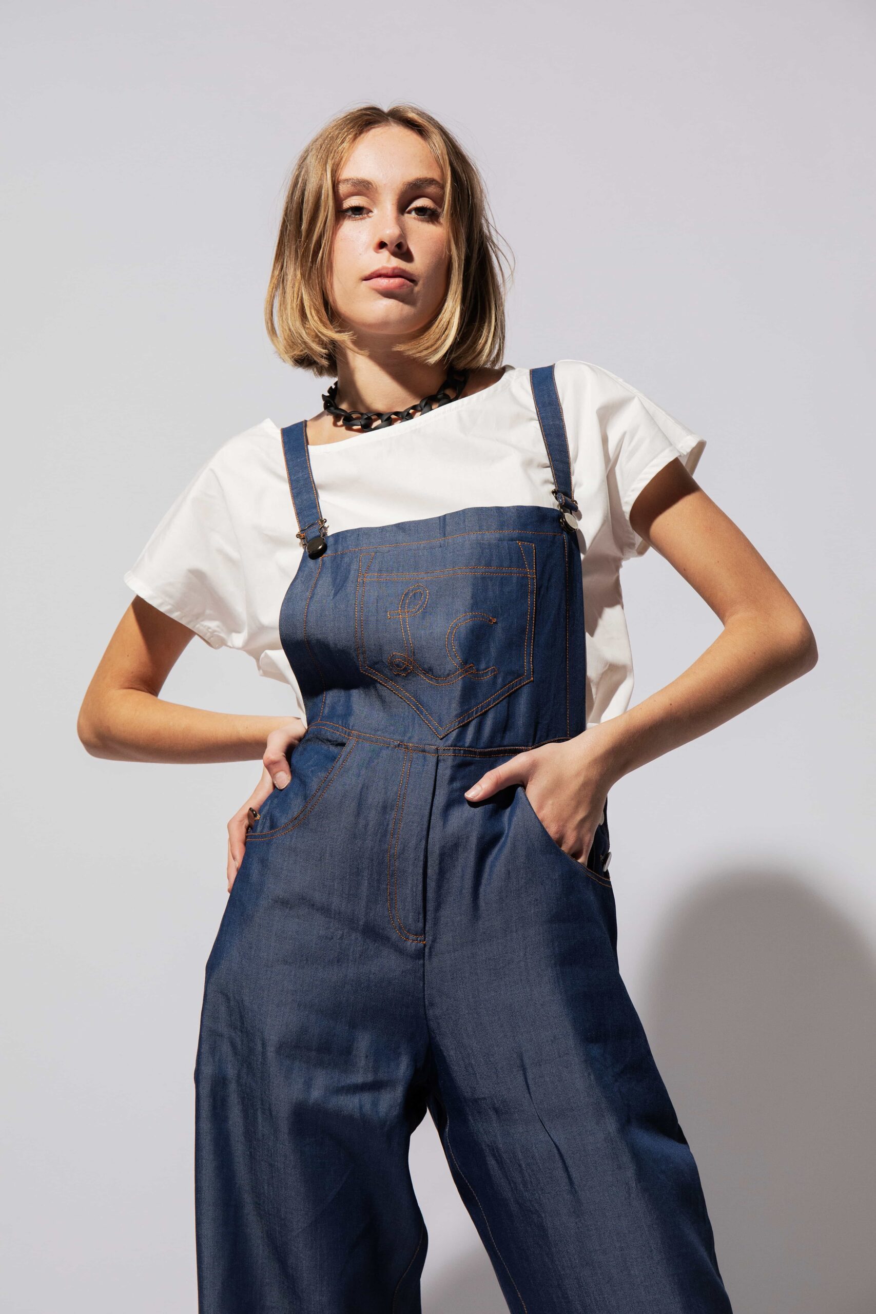 Salopette in jeans leggero leggermente lucido. bottoni in metallo, tasche a toppa dietro, apertura con bottoni laterali